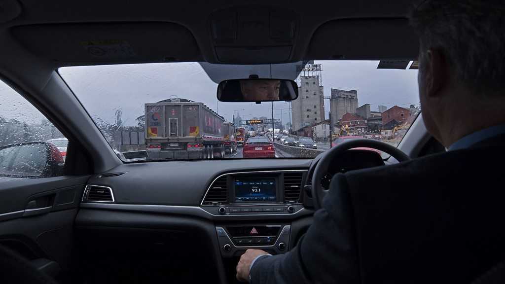 This system gets an interruption every now and again, generally when Andrew gives a lift home to his younger colleague David (Easteal himself, adding to the long list of credits he has on this movie, also acting as producer, editor, and sound recordist). We never hear the other side of Andrew’s phone calls, only his responses, so it’s in these in-person chats with David that we really learn about him, slowly picking up his history and worldview while a friendship of circumstance emerges between the two, earnest and sometimes awkward, always tinged with impermanence as David looks for a new job.