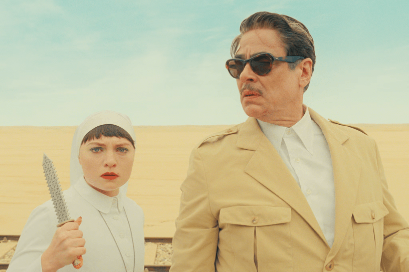 The most basic shift here, despite a cast list that runs at a typical Andersonian length and star-wattage, is that The Phoenician Scheme is far, far less ensemble-y than The French Dispatch or Asteroid City. Instead, just three characters take constant centre stage – industrialist and war profiteer Zsa Zsa Korda (Benico del Toro), his estranged nun daughter Liesl (Mia Threapleton, aka Kate Winslet Jr), and gentle-natured Norwegian entomology professor/administrative clerk Bjorn (Michael Cera).