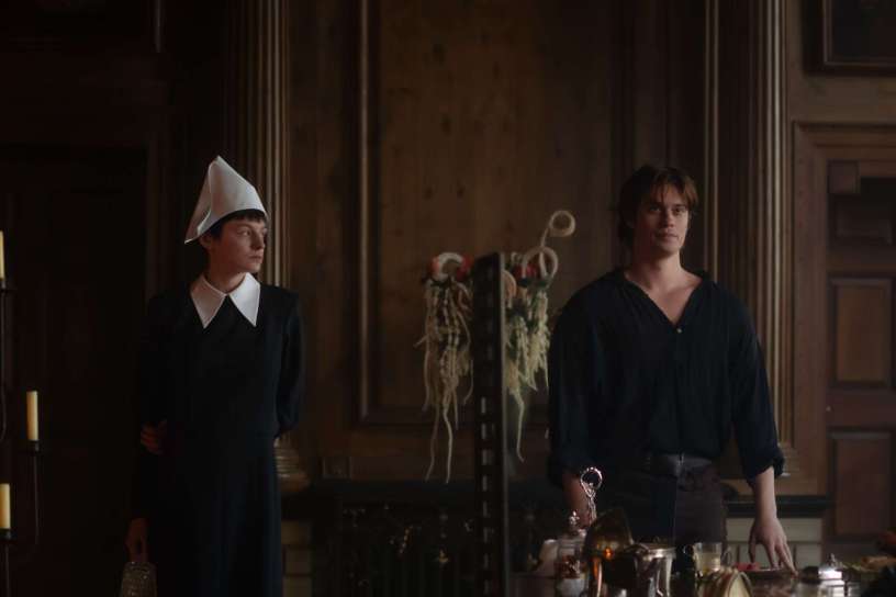 She’s given 100 nights to conceive, while Jerome flees again from sex by pretending to go away on business, leaving Cherry in a lose-lose situation with his hunky friend Manfred (Nicholas Galitzine), who Jerome bets cannot seduce Cherry within those 100 nights. If Cherry is not pregnant by the time Jerome gets back, she’s dead, but if she is pregnant, then it will be with Manfred’s child and, again, she’ll be dead. Her only ally is her maid Hero (Emma Corrin), a mystically gifted storyteller (and, secretly, a literate woman) whose tales have the power to alter time.